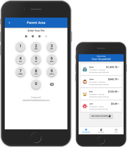 Guardian Savings has re-imagined how kids interact with their savings. Below we have screenshots from throughout the app with bullet points explaining the value and and intention behind each feature.